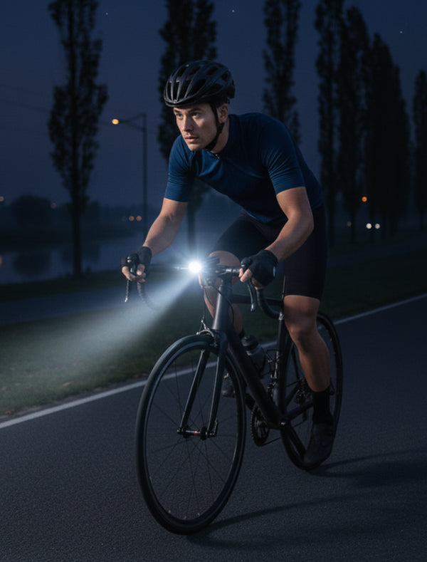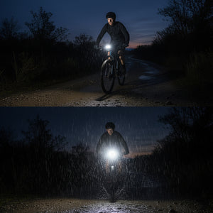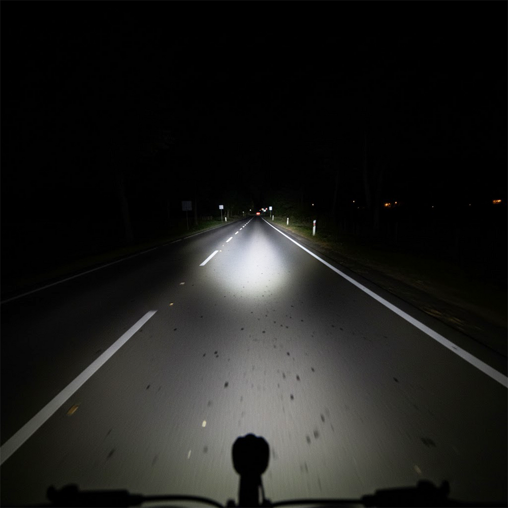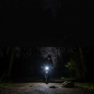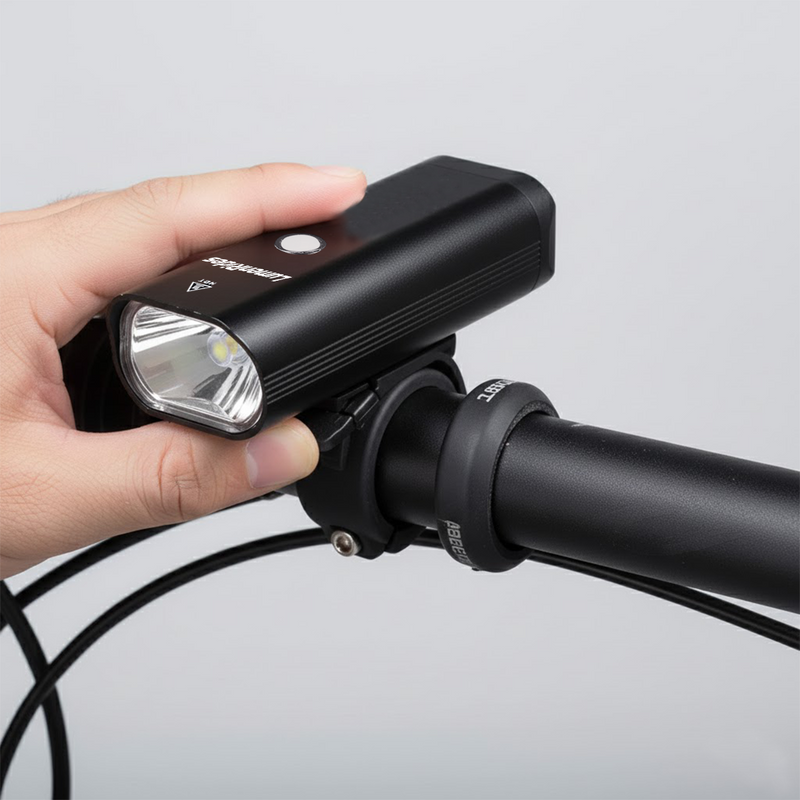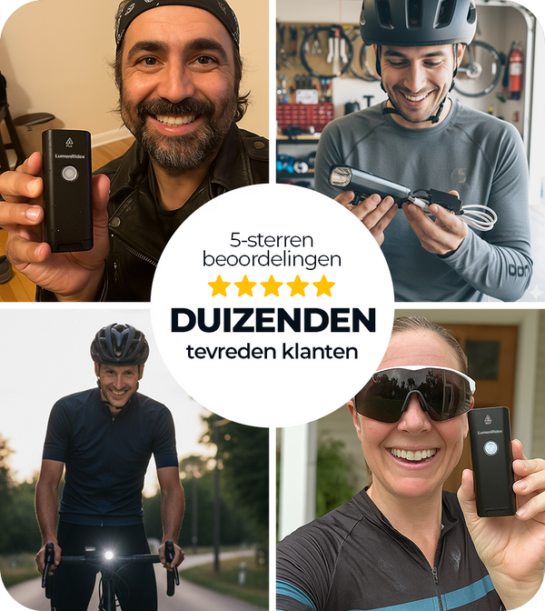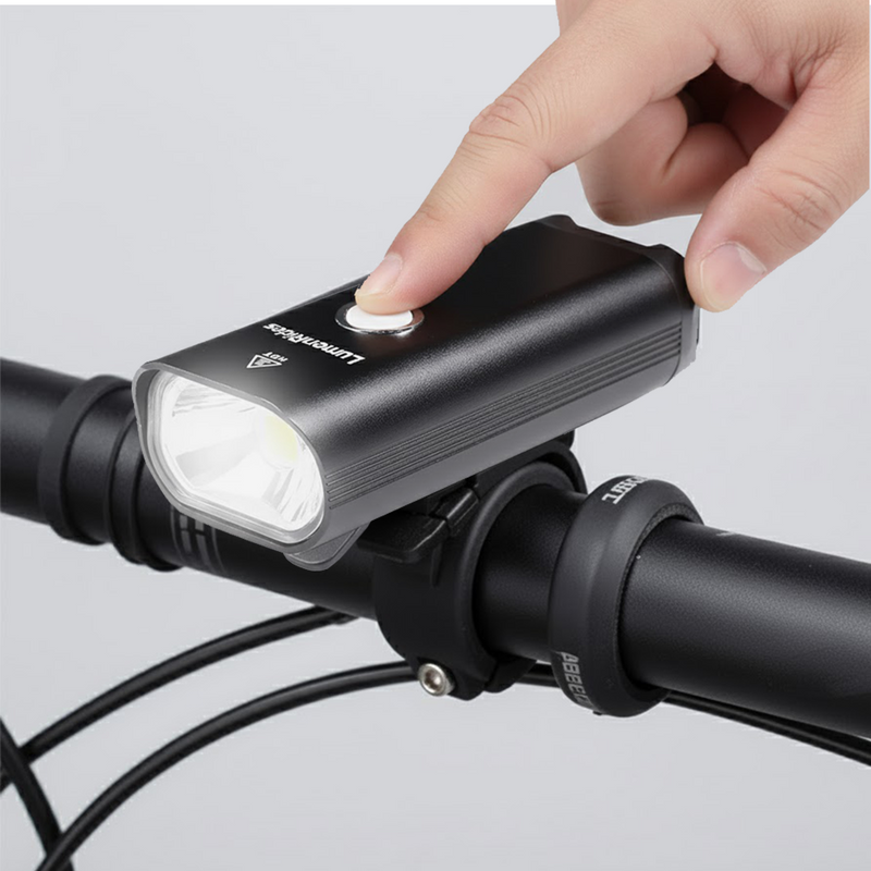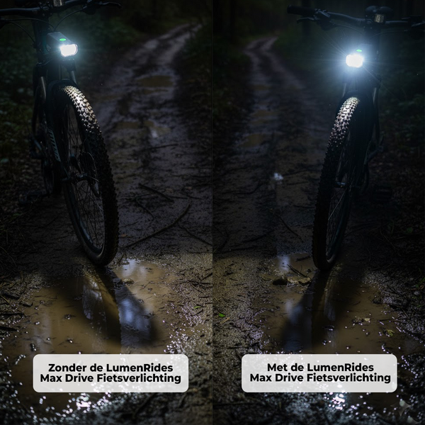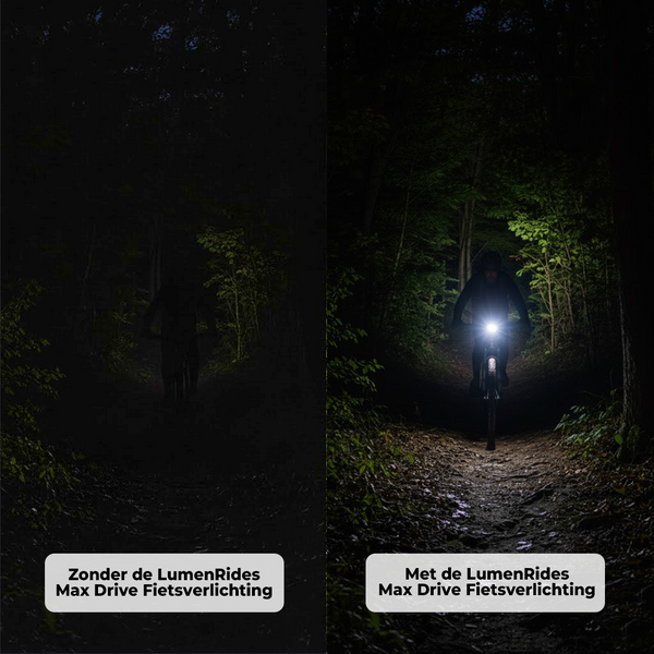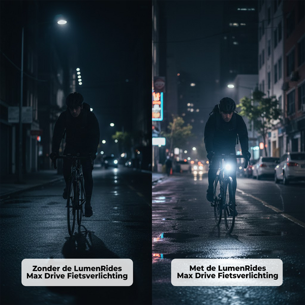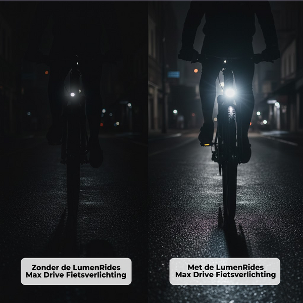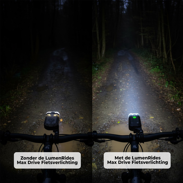 In de doos vind je de LumenRides Max Drive voorlamp voor op de fiets, een duurzame stuurhouder met een verstelbare band en een handleiding om je direct op weg te helpen. De lamp heeft een geïntegreerde USB-C-oplaadpoort, zodat je hem binnen enkele minuten eenvoudig kunt opladen en op pad kunt.